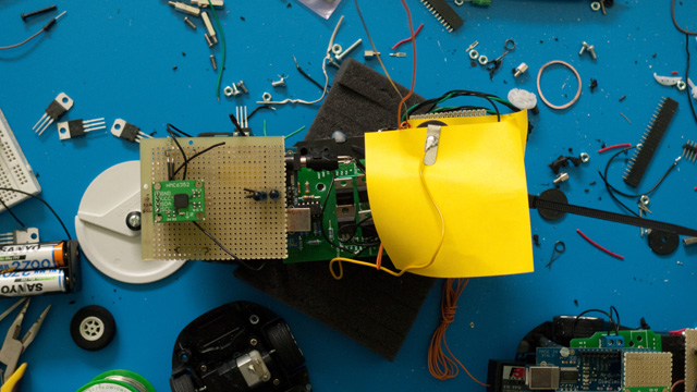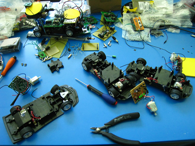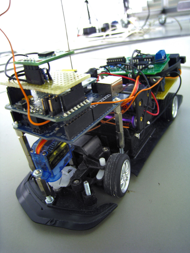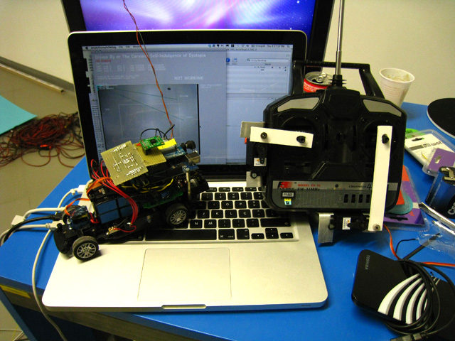Prototype I 10 arduinos, 3 digital compasses, 4 xbees, 9 servos, 3 dc motors, 3 h-bridges, 3 radio control transmitters and receivers, computer, video camera, video capture card, batteries, power supplies
