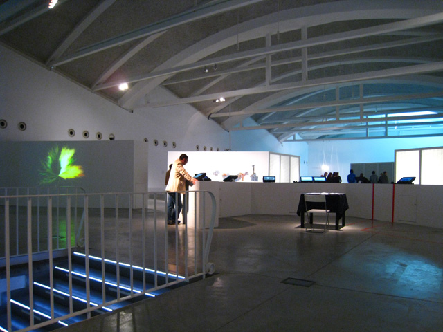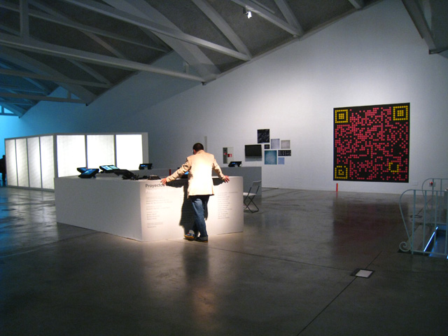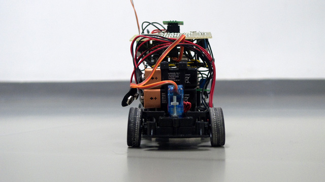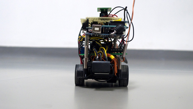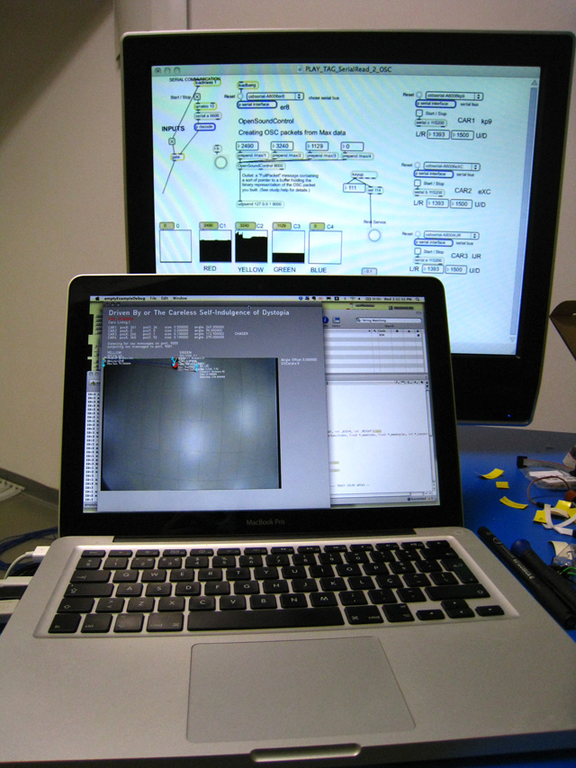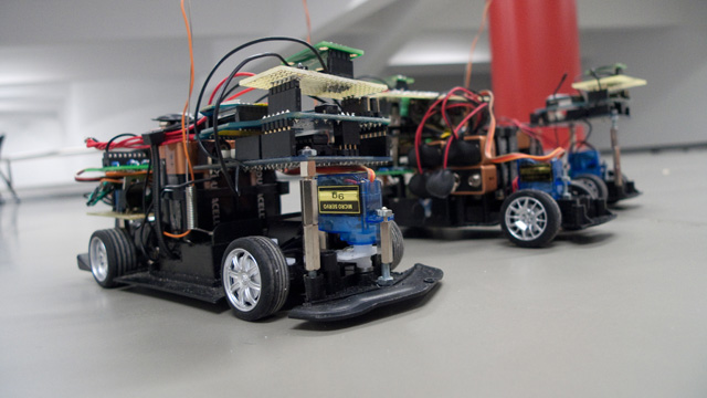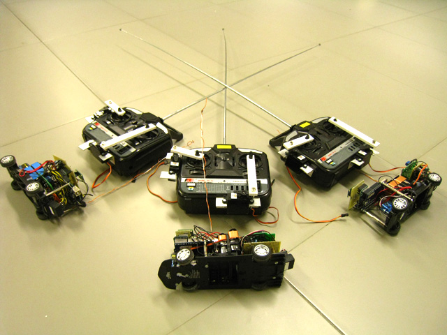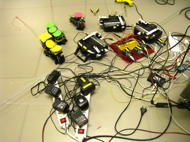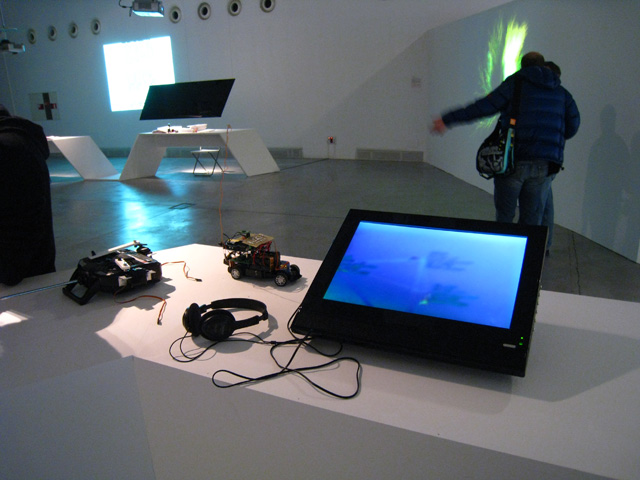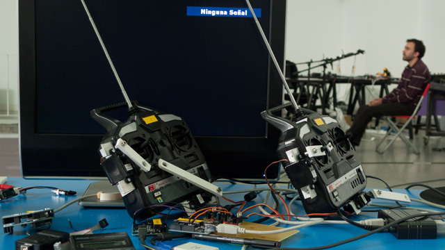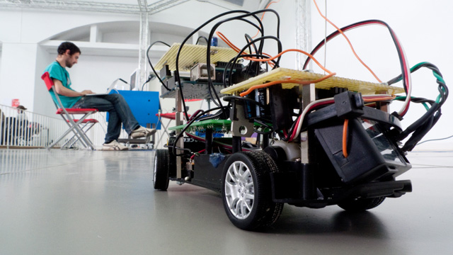 The system in this installation is comprised of two entities: The first, a computer and a video camera, captures all information referring to each of the motorised vehicles: identity, position, speed, motion vectors, collision routes and other pertinent calculations. This information is updated in real time and available on request for the elements that constitute the second entity, the motorised vehicles.