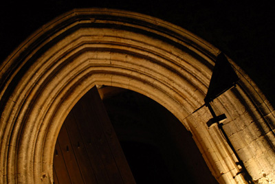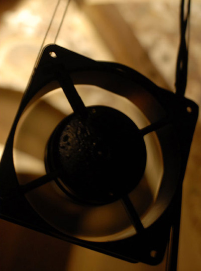 A wind fane was installed in the windy church entrance, the fane was attached to a modified pot that would turn 360º (instead of the normal locked rotation of aprox. 270º) and still act like a normal variable resistor, this pot was conected to an arduino board which ran an algorithm that would interpolate the "blind" 90º of the modified pot based on the wind recent history and calculate the actual wind direction. There were four computer fans hanged inside the church in an cardinal points fashion, north - top, south - bottom, east - right, west - left, these fans were connected to a midi controlled dimmer that was receiving commands from the arduino board through a midi out connection.