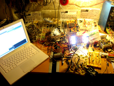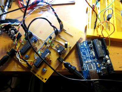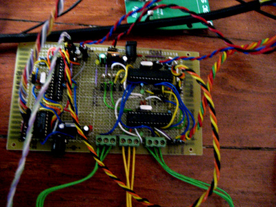 Arcade machine, 2 analog joysticks, 2 tvs, coin dispenser, 5 diy arduino based network, 26 led score display, 2 motors, 2 fans, 4 optocoupled h-bridges, 2 printer head mechanics, hair dryer, 2 infra-red sensors, 4 switches, 2 potenciometers, button, 220v 5v relay system, 2 fluorescent lamps, 8 power supplies, wood structure, video camera