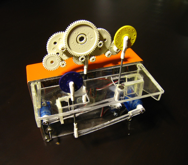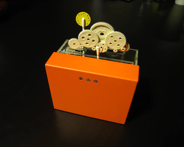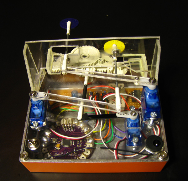 » It features a Real-Time Clock and calculates the sun position in the sky based on date, longitude and latitude. These positions are then mapped to the servos that lift the sun and moon rod to their actual respective positions. Three light sensors feature an algorithm that analysis light changes and lifts a cloud accordingly. |