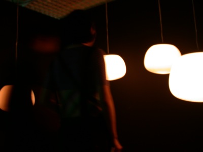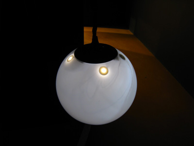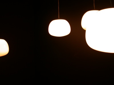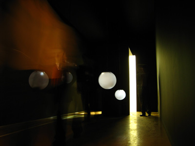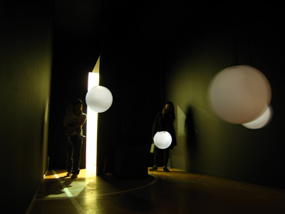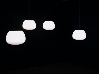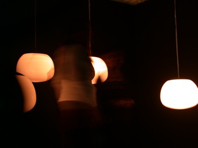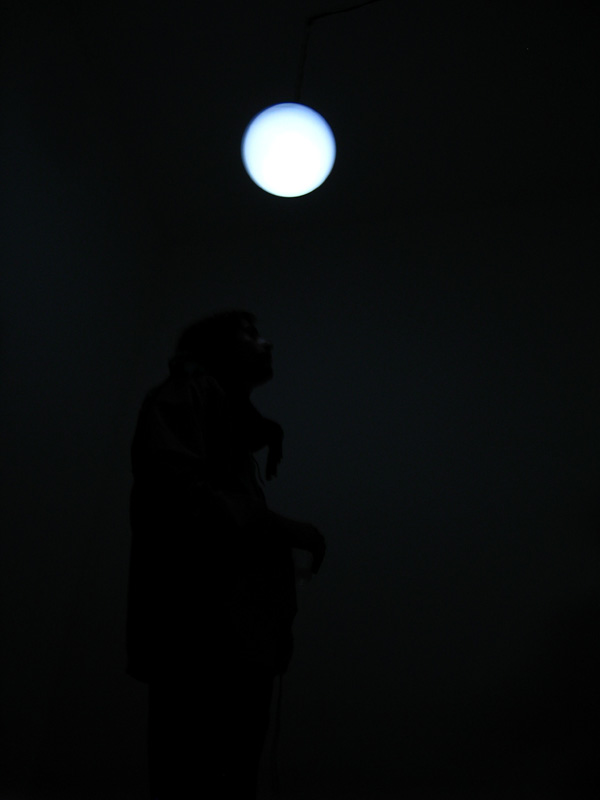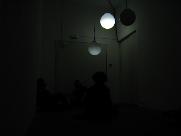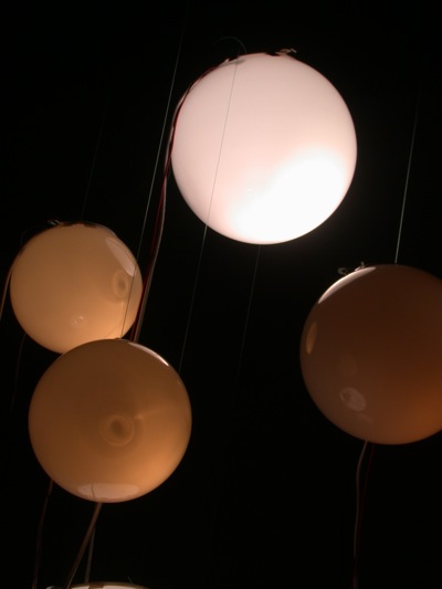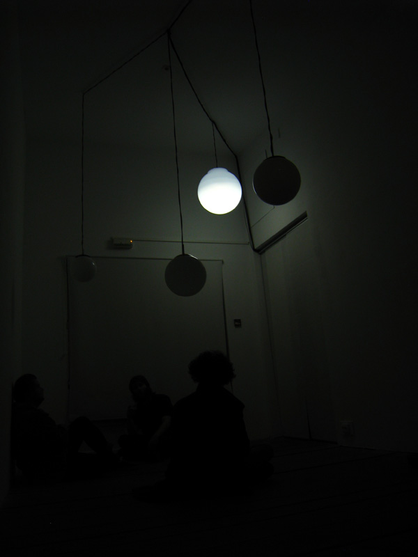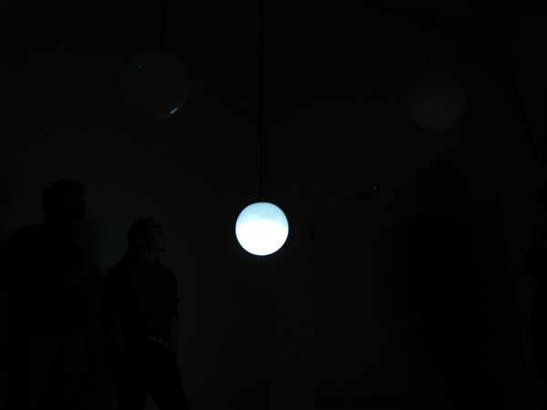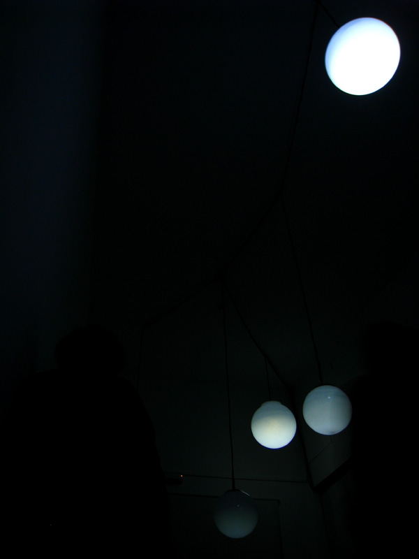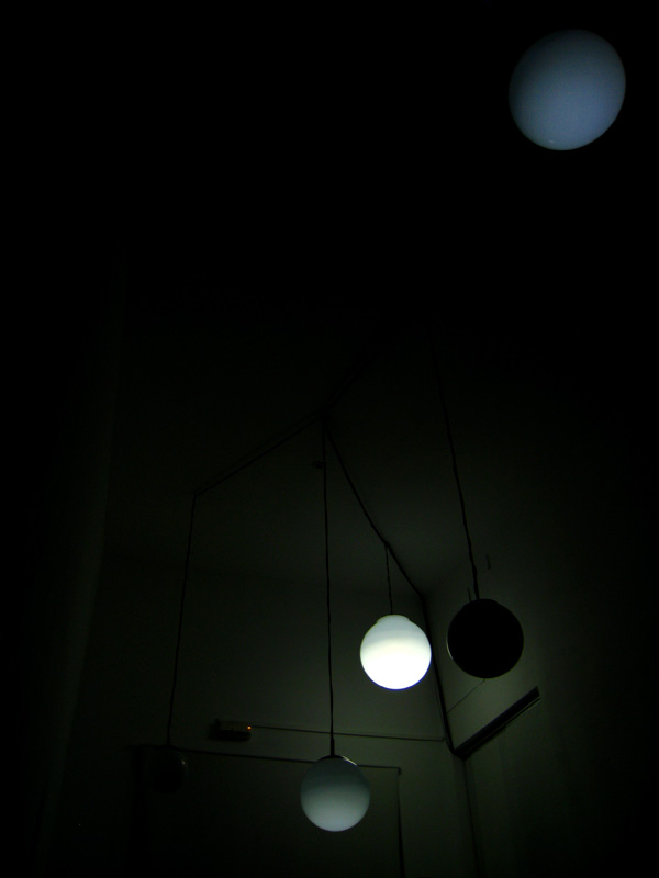 Six objects suspended from the ceiling at different heights, each one made with a white glass globe with one microphone, one speaker and one electrical lamp inside. Each speaker were individually connected to a computer that triggered 6 different frequencies one for each of the speakers, this frequencies were tuned to be the natural frequencies of the objects pushing them to resonate.