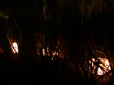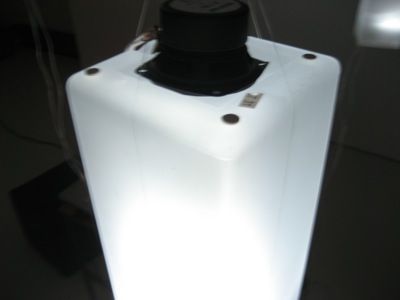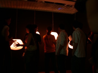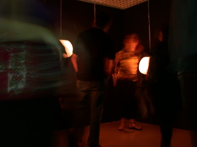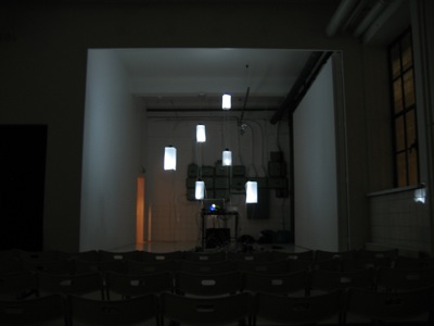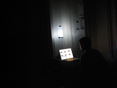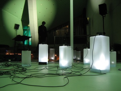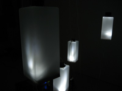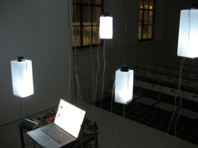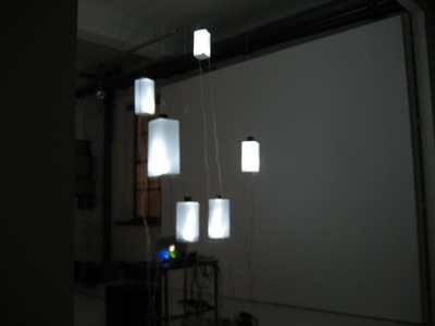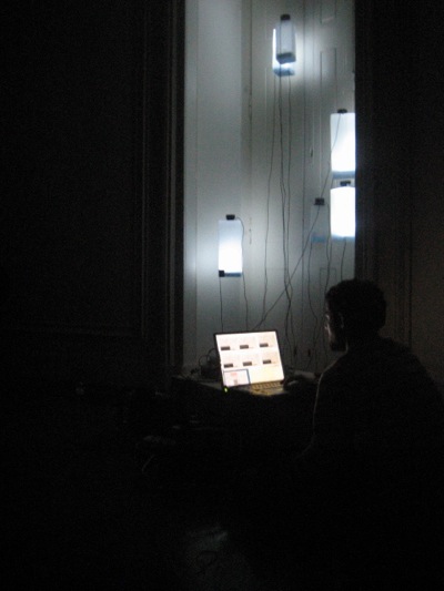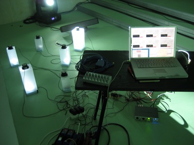 This resonancies were captured by the object's microphones and redirected to a 6 envelope follower system (that converted the amplitude of each audio signal to midi messages) This midi messages were then sent to the computer which formatted the incoming midi values and sent them to six dimmers controlling the light intensity of each object in a way that each object light intensity was directly related to it's own sound amplitude.