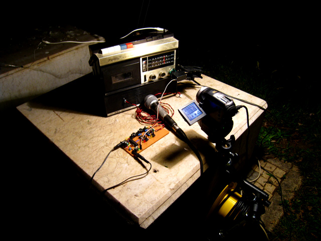 radio, servo motor, microphone, envellope follower, diy arduino based board, video camera, tripod